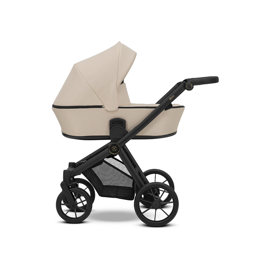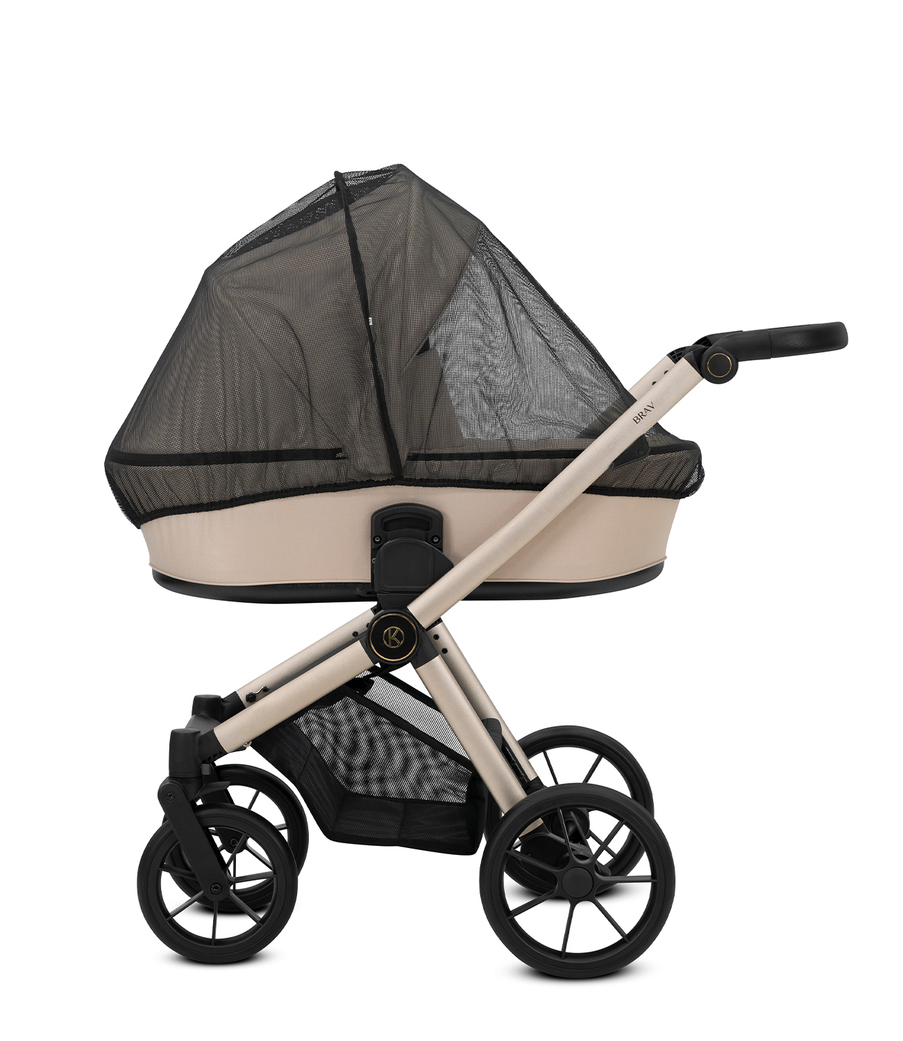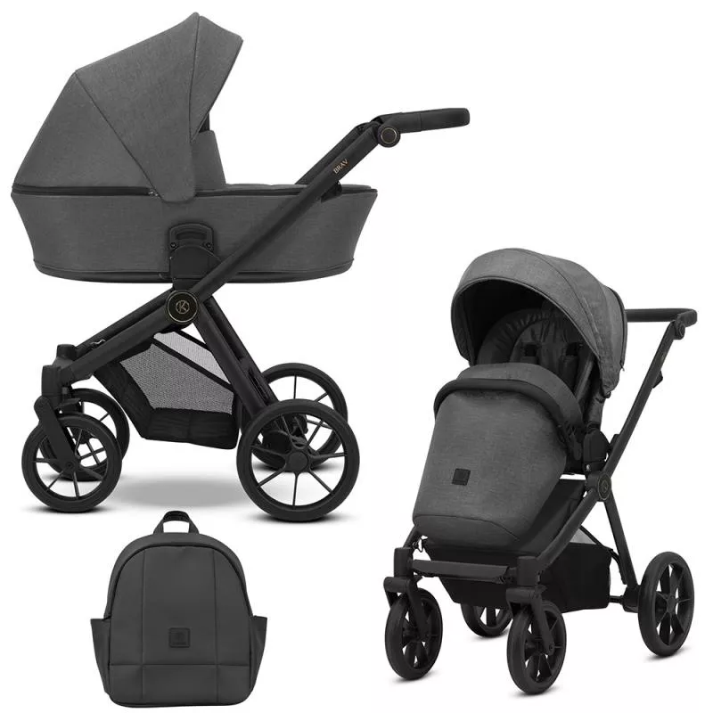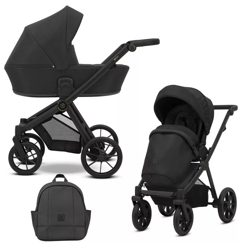 El cochecito Brav cuenta con el chasis con acabados en negro o champagne dependiendo del modelo, e incluye todos los complementos necesarios para el paseo: bolso mochila, burbuja de lluvia, mosquitera, cubrepiés para la silla de paseo y portabebidas.