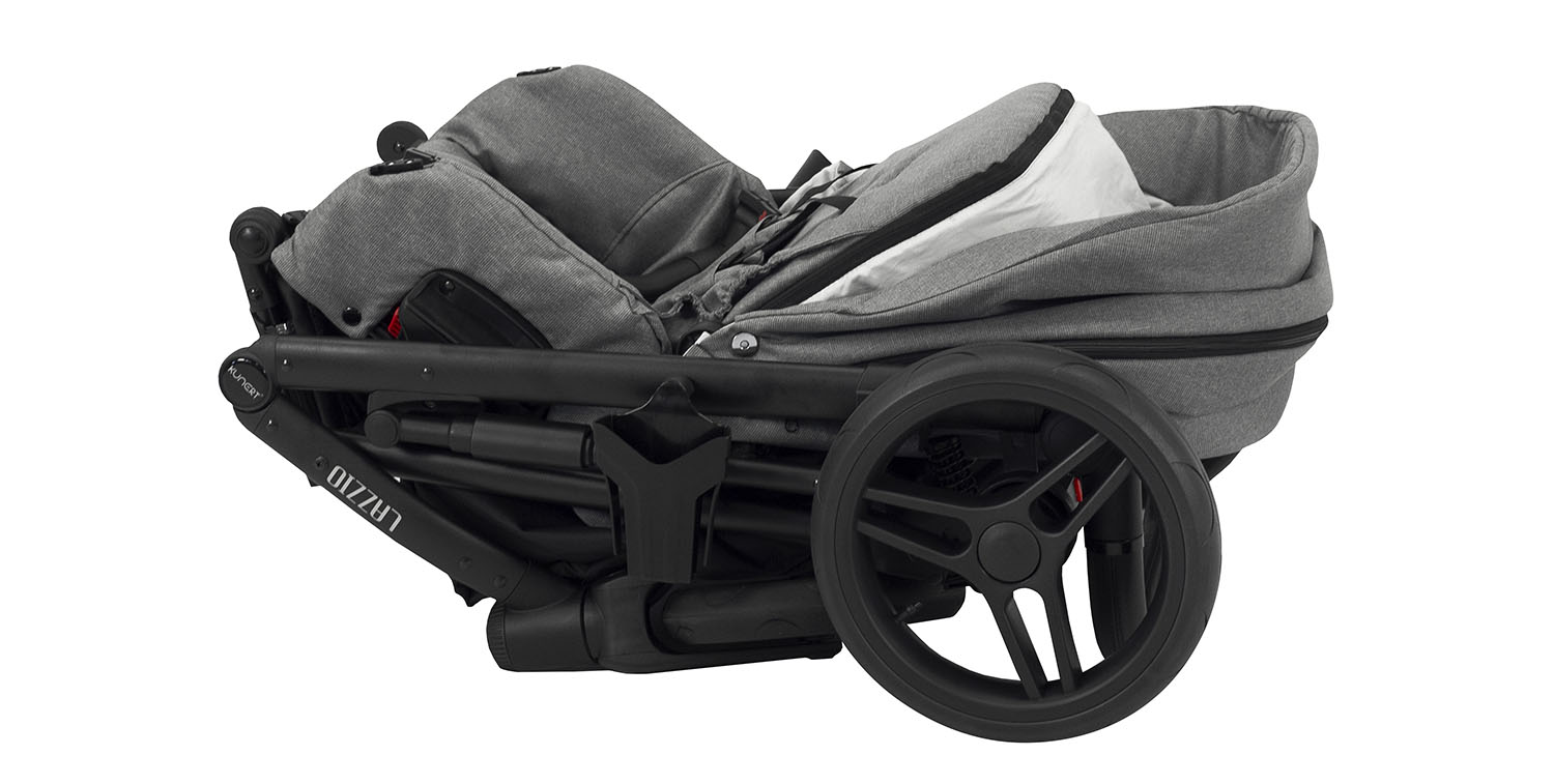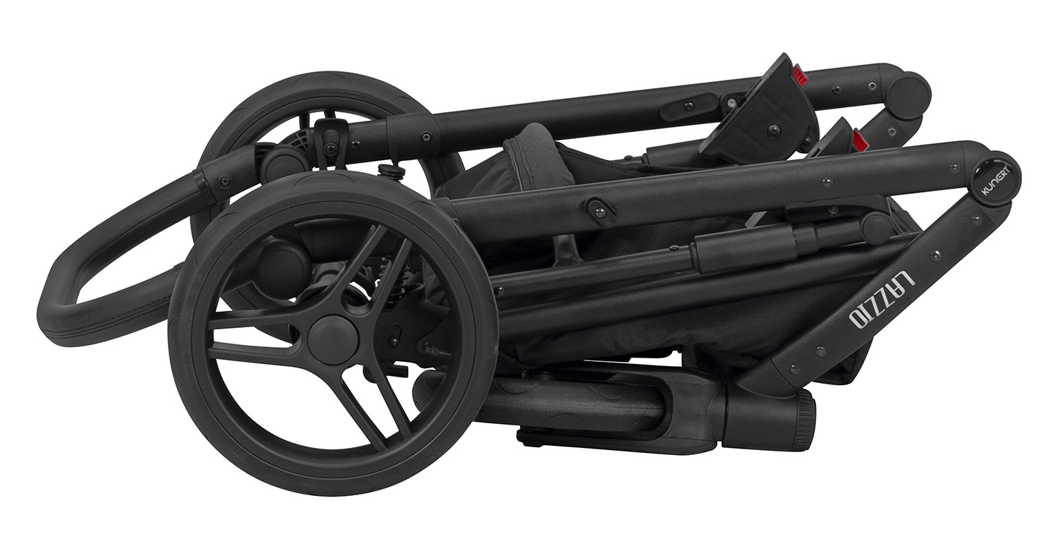 A la hora de plegar tu carrito Lazzio, se puede hacer de forma fácil simplemente pulsando hacia arriba los seguros que hay a ambos lados del chasis. Gracias a su mecanismo de seguridad el chasis no se puede plegar solo y lo puedes llevar de forma segura. Tampoco es necesario quitar la silla de paseo, ya que lo puedes plegar con la silla puesta.