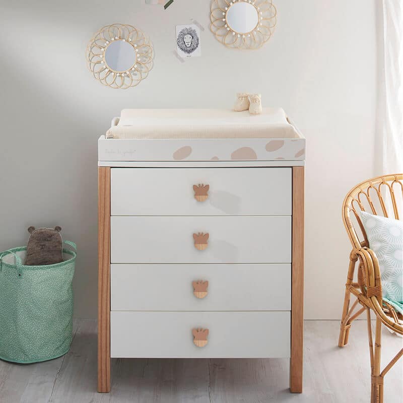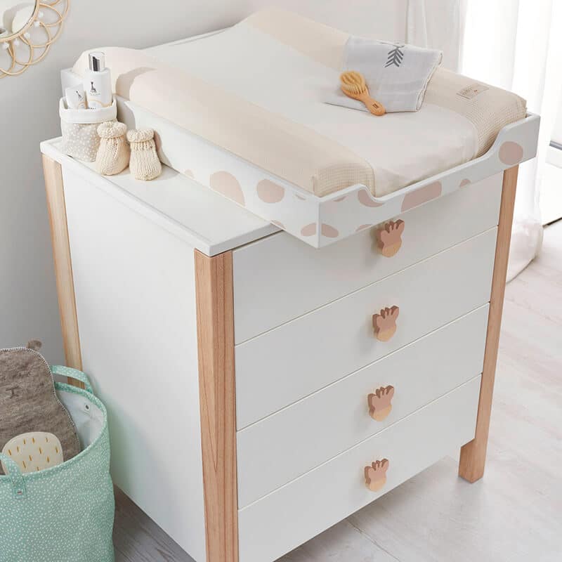 Redescubre el universo suave y cálido de Sophie la girafe con esta cómoda de diseño moderno y atemporal. El cambiador (accesorio opcional) te viene incluido dentro de este estupendo pack para que tengas todas las comodidades de la habitación de Sophie.