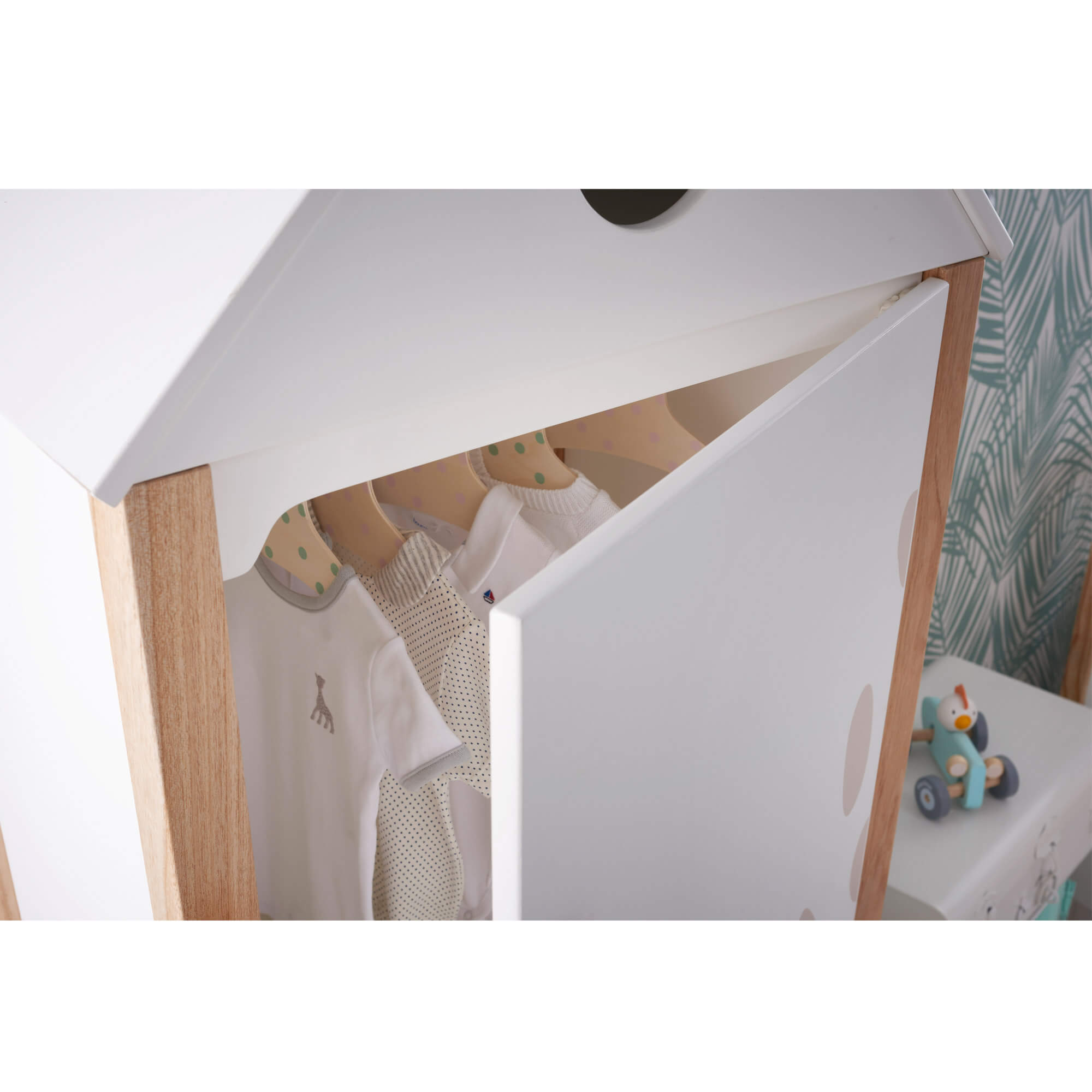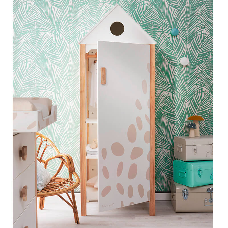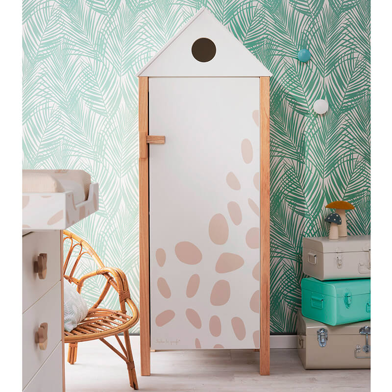 Precioso armario en forma de cabaña con diseño inspirado en Sophie la girafe, le dará a la habitación un toque original y atemporal. Diseñado respetando el medio ambiente, preservará la calidad del aire de la habitación.