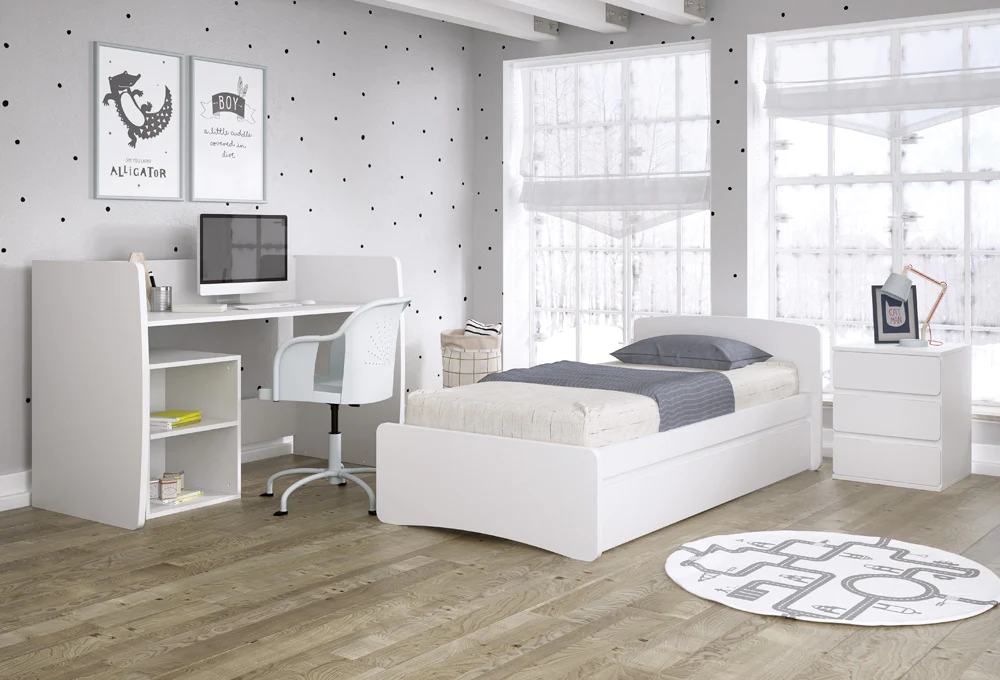 Cuando el bebé crece, Combi Nest se transforma en cama de inspiración Montessori de 190×90 cm para fomentar su autonomía, le permitirá que pueda subir y bajar solito, y su escritorio y dos mesillas serán perfectos para su espacio de lectura y juegos.