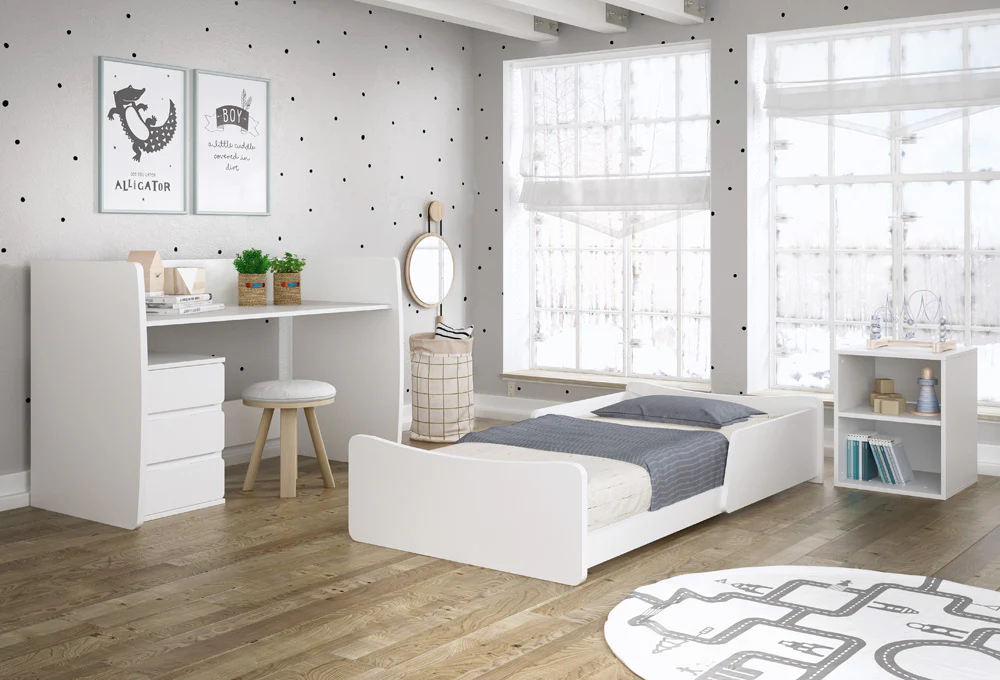 Cuando el bebé crece, Combi Nest se transforma en cama de inspiración Montessori de 190×90 cm para fomentar su autonomía, le permitirá que pueda subir y bajar solito, y su escritorio y dos mesillas serán perfectos para su espacio de lectura y juegos.