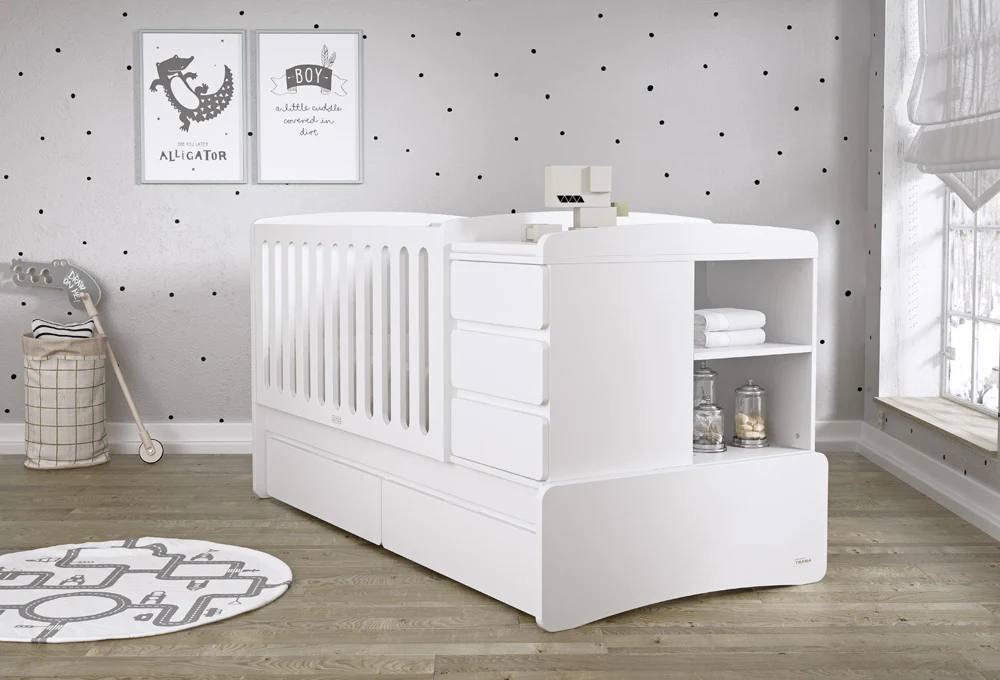La Combi Nest de Trama es la primera cuna convertible que se transforma en una habitación infantil con cama, escritorio, dos mesillas y con opción de cama Montessori.