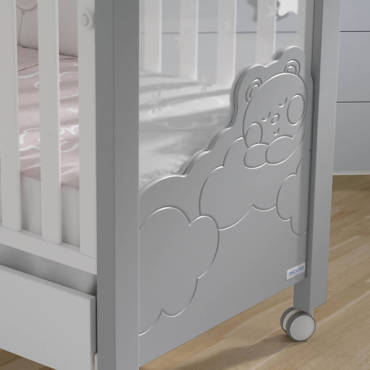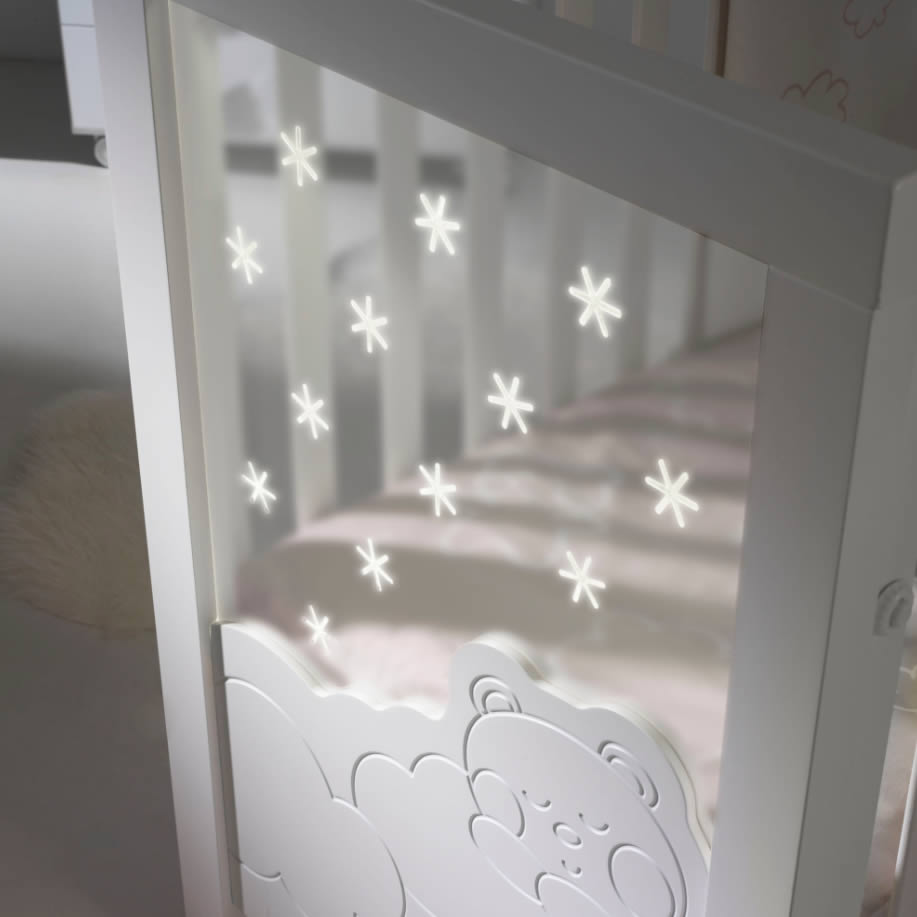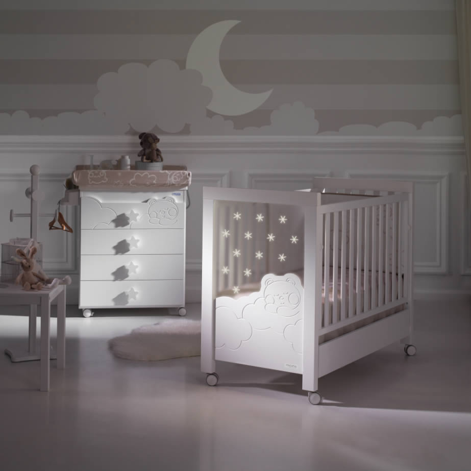 La cuna Dolce Luce de Micunacombina el diseño más dulce con la tecnología más innovadora, que permite acoplar a la cuna un suave sistema de iluminación LED de acompañamiento y vigilancia.
