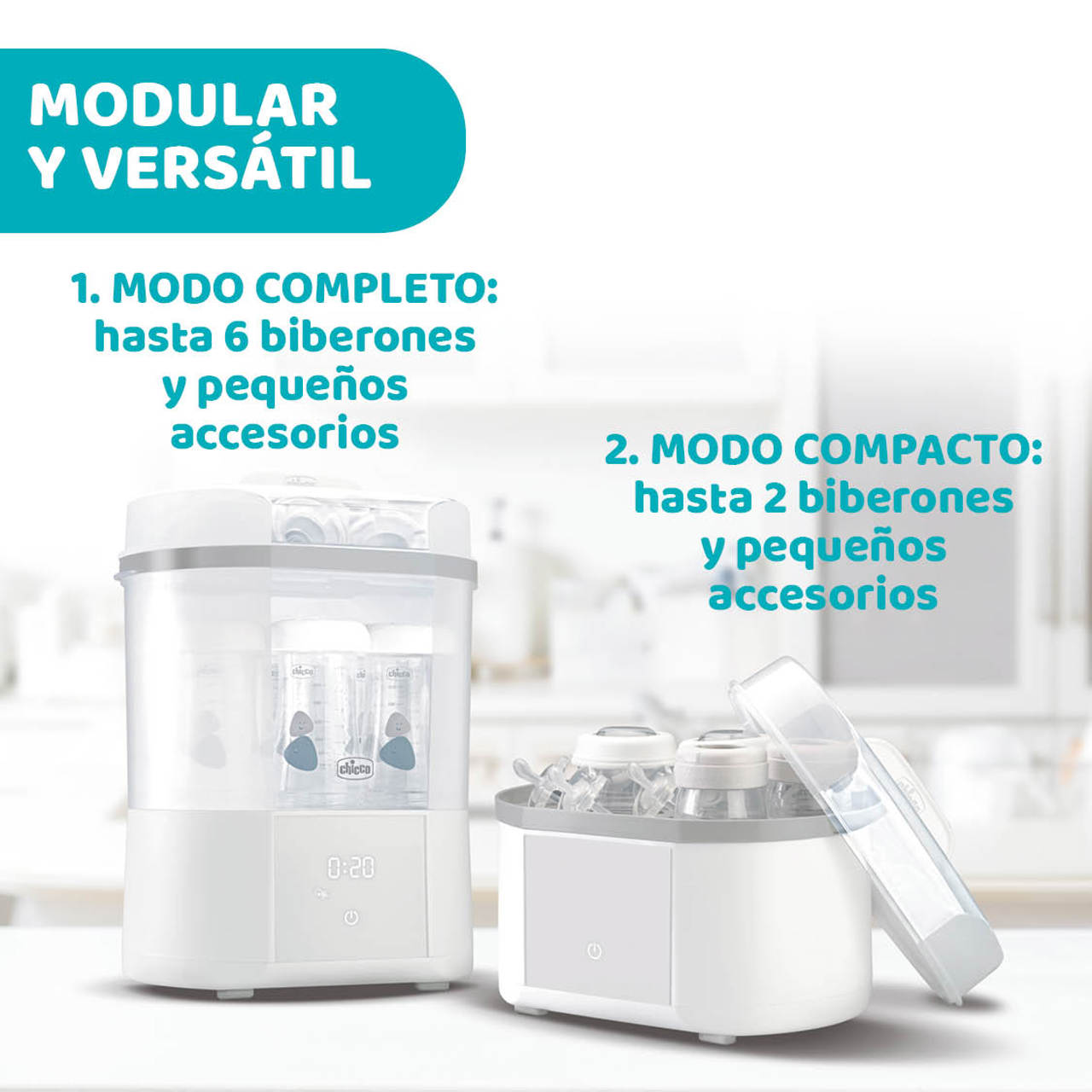 - MODULAR: Modo Completo (hasta 6 biberones y otros accesorios como chupetes); Modo Compacto (hasta 2 biberones, 1 sacaleches o chupetes).