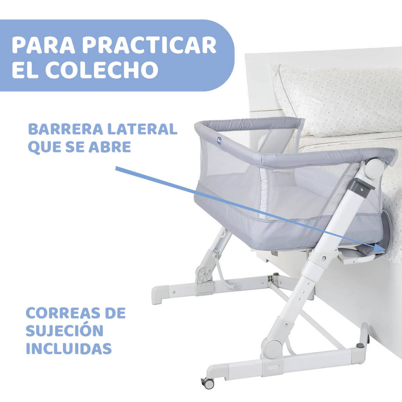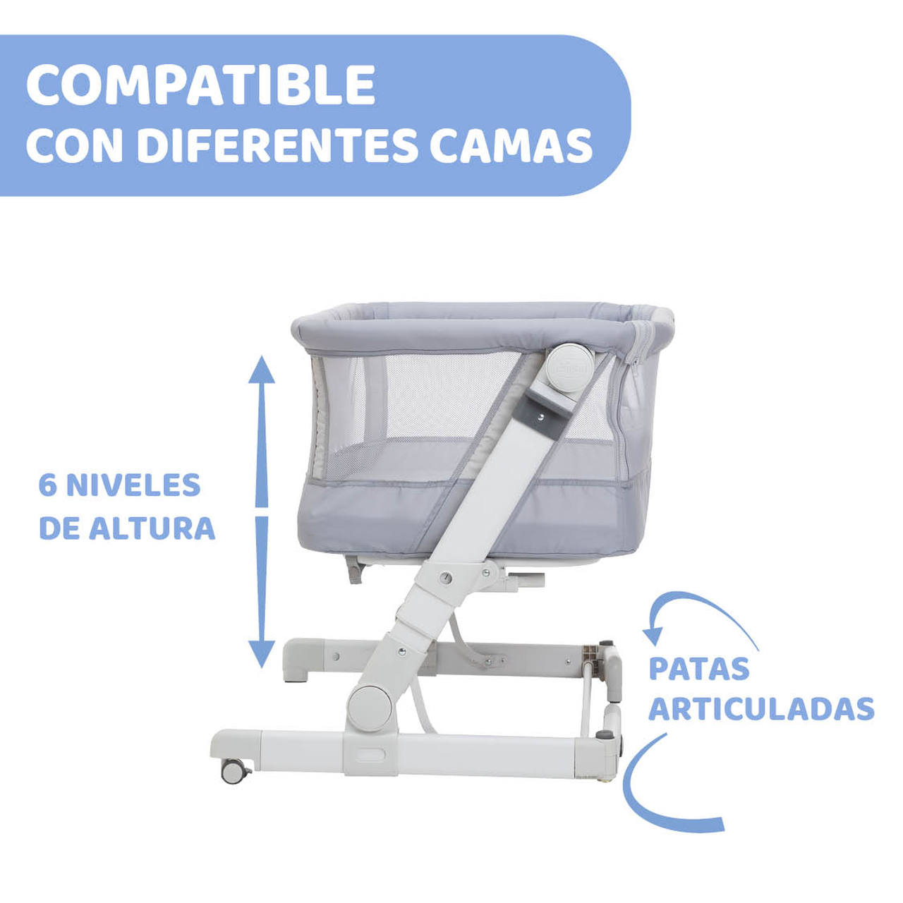 Cuando está plegada, esta cuna es súper compacta, por lo que es la cuna de viaje perfecta para llevar a cualquier parte guardada en su bolsa. Además cuenta con 6 ajustes de altura, sistema inclinable y con patas plegables que te permiten acercarla a la cama para practicar el colecho, ya sea con camas con canapé o cajoneras, da igual, porque esta cuna es compatible con la mayoría de las camas.