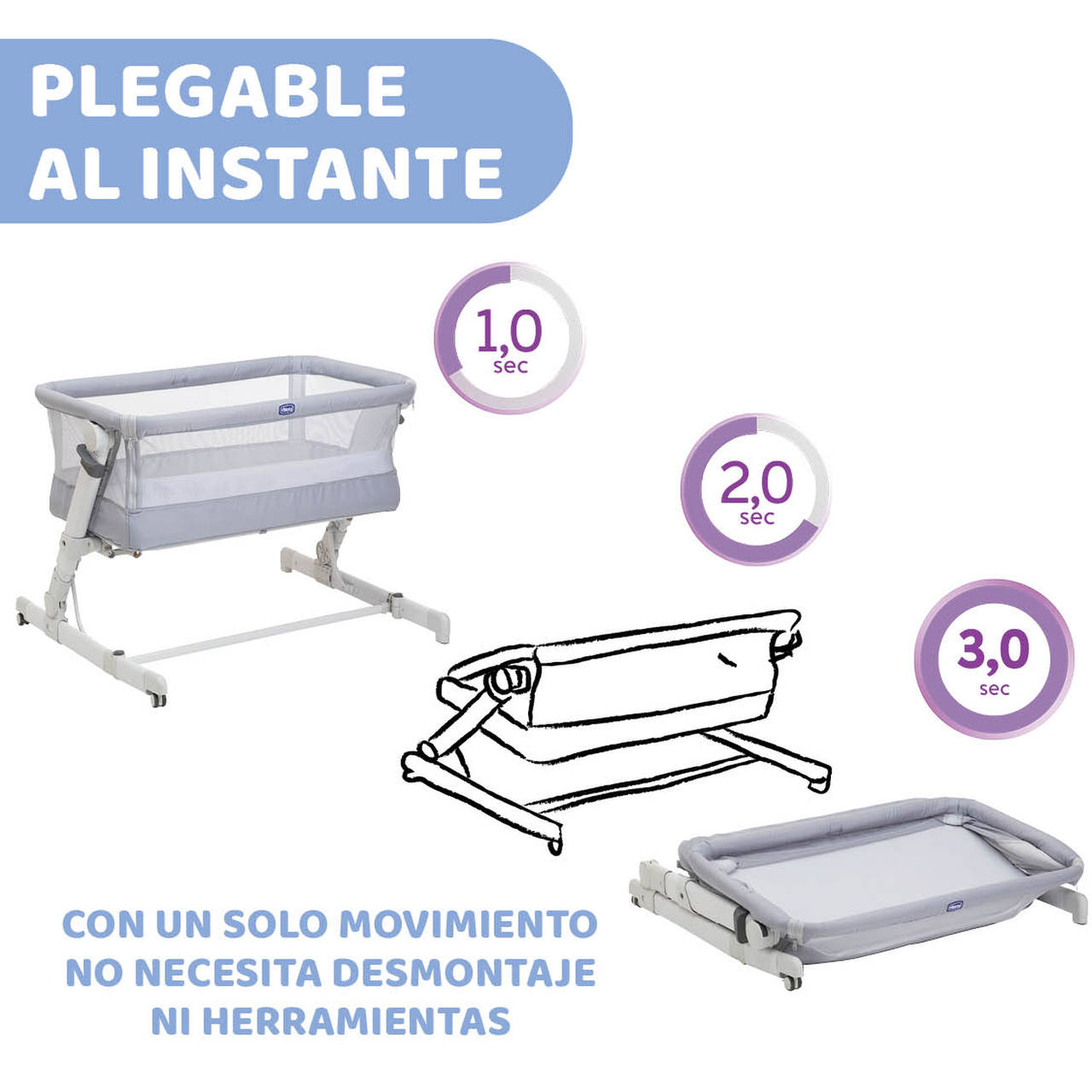 La nueva minicuna colecho Chicco Next to Me Pop Up es la minicuna con un innovador sistema de plegado que te permite plegar y montar la mini cuna al instante, sin quitar el colchón ni desmontar ninguna pieza. Diseñada para padres muy organizados o viajeros que deseen una cuna práctica que puedan guardar y montar tantas veces como necesiten.