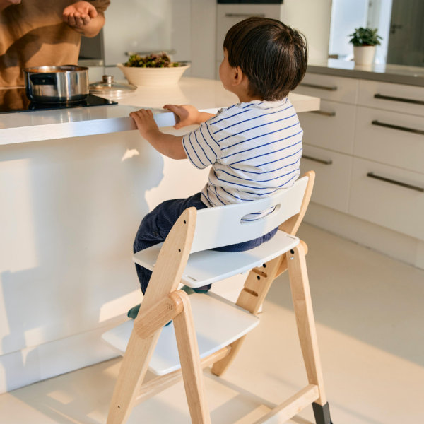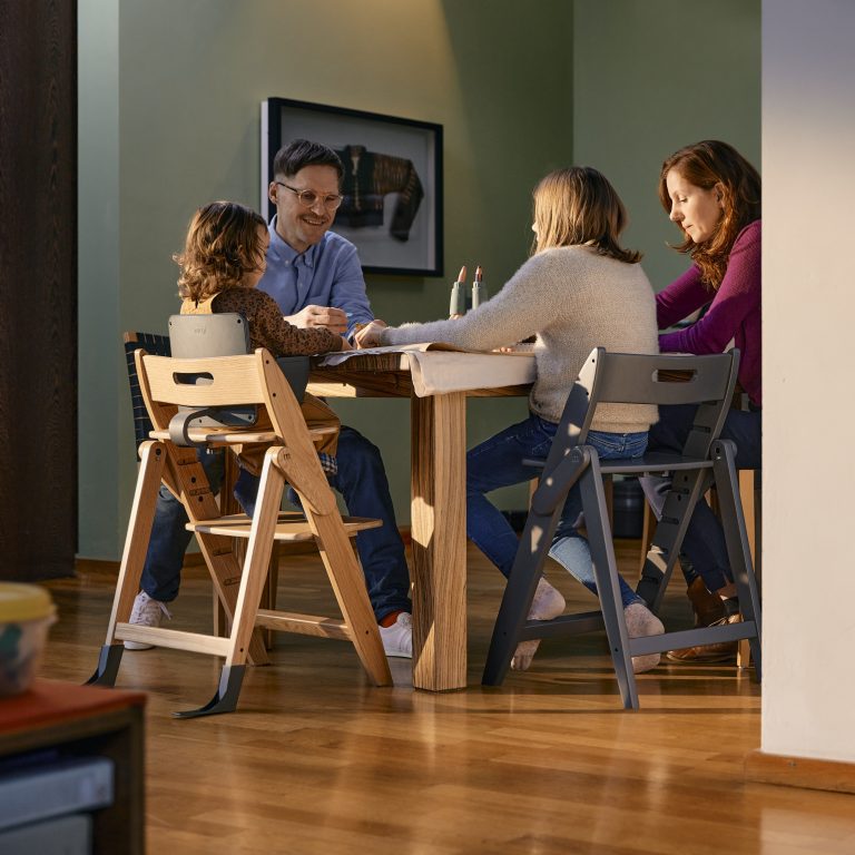 La trona Yippy no solo acompaña a tu hijo desde el primer día, sino a toda la familia en el día a día. Si no hay suficientes sillas en la mesa de una celebración familiar, la trona Yippy se puede usar sin ningún problema. Ideal: El amplio piecero sirve de asiento para los grandes.